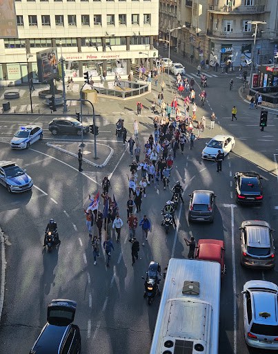 Kolona je uz glasne ovacije i uzvike "Pumpaj" pošla od Fakulteta dramskih umetnosti i uputila se Bulevarom umetnosti u pravcu Zemuna, javlja reporter agencije Beta koji će pešačiti sa njima.