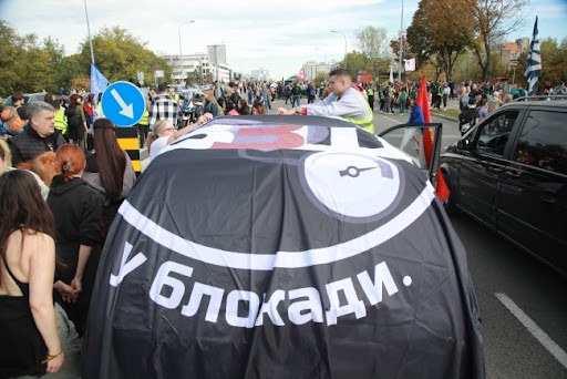 To je bila prva duža pauza, koja je trebalo da traje 25 minuta, ali je potrajala gotovo sat, a učesnici povorke su posedali gde god su našli mesto - po putu, trotoaru i žardinjerama.