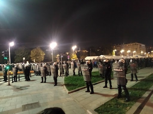 Saobraćaj je obustavljen u široj okolini, dve strane razdvajaju kordoni policije, a povremeno lete pirotehnička sredstva.