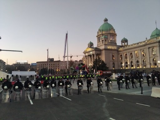 Kordoni policije u opremi za razbijanje demonstracija u potpunosti okružuju zgradu parlamenta, a veliki broj policajaca je i uz ogradu na uglu Bulevara kralja Aleksandra i Takovske ulice, koji razdvaja dva skupa, javio je reporter agencije Beta.