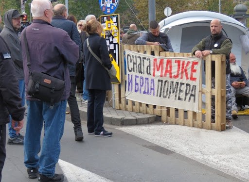 Ispred šatora je okačen transparent "Snaga majke i brda pomera", a istaknuta je i velika srpska zastava, izvestio je reporter Bete.
