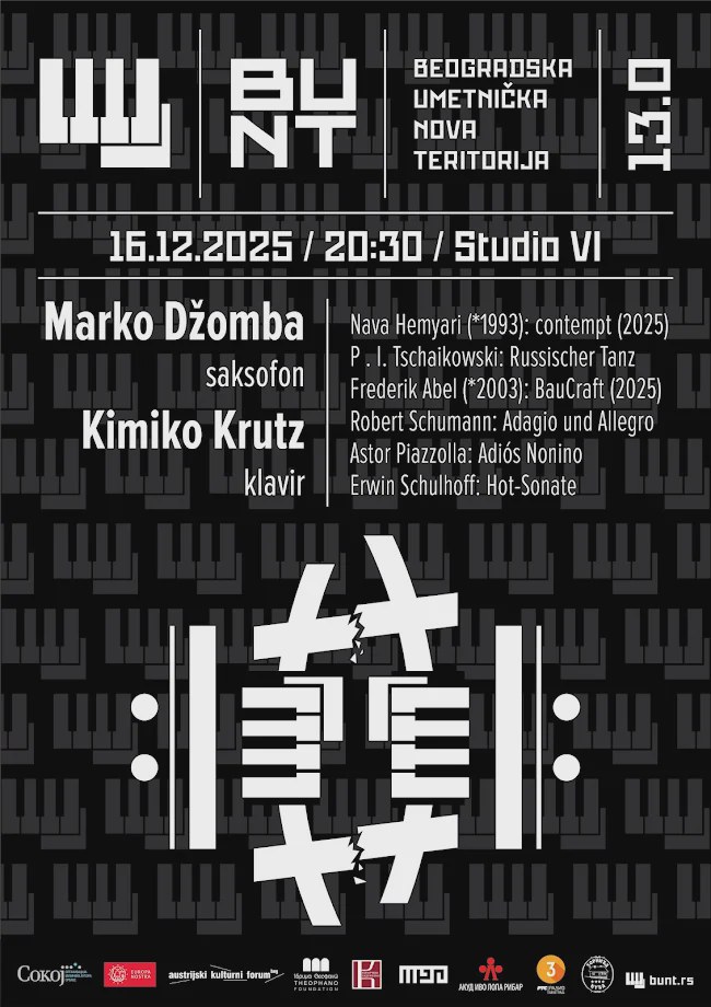 U Studiju VI u Beogradu sutra uveče će biti održan završni koncert Međunarodnog festivala klasične muzike BUNT 13.0 sa nastupom saksofoniste Marka Džombe uz klavirsku saradnju Kimiko Kruc (Krutz), saopštili su organizatori.