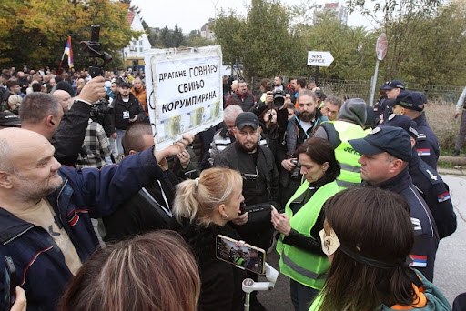 Ispred policije su bili i redari, organizatori protesta, u fluorescentnim prslucima, a učesnici protesta pravili su buku duvanjem u pištaljke, bez pokušaja da priđu samoj zgradi redakcije.