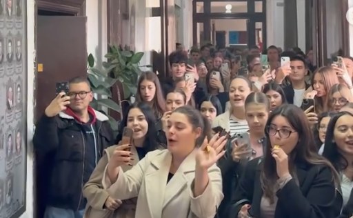 Nakon isteka šesnaest minuta tišine, za 16 žrtava u padnu nadstrešnice novosadske železničke stanice, gimnazijalci i nastavnici su uz pištaljke i glasne povike ušli u zgradu Valjevske gimnazije.