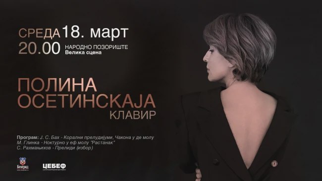 Pijanistkinja Polina Osetinskaja nastupiće u sredu, 18. marta u Narodnom pozorištu u Beogradu, gde će na solističkom koncertu izvesti dela Johana Sebastijana Baha, Mihaila Glinke i Sergeja Rahmanjinova, saopštili su danas organizatori.